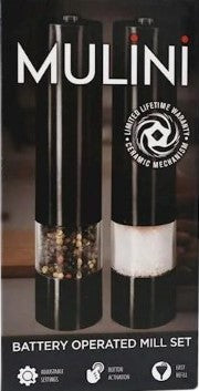 With a modern sleek design, the Mulini Electric Salt & Pepper Mill set is the perfect addition to any kitchen. The 22cm Black mills will suit any style of home. Featuring an adjustable grinding mechanism with 3 settings, the mills also offer one touch operation and are simple and easy to refill. The mill lights up when in operation. The Mulini Electric Salt & Pepper Mill set is not filled so you can fill with your own choice salt or pepper.